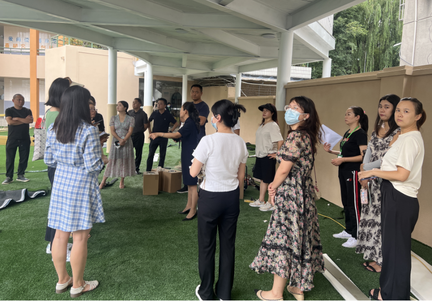 假期中,幼儿园进行了户外维修改造工程,工人师傅们顶着炎炎烈日,紧张忙碌地作业,总公司和基建处的相关领导经常到幼儿园视察施工进度,确保幼儿园能顺利开园。