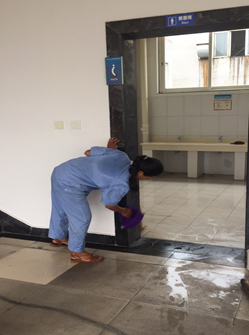 保洁人员在创业创新中心对厕所卫生进行清扫