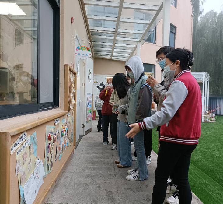 在清晨的微雨中,同学们来到幼儿园,行政老师把同学们分成3个小组,他们在幼儿园优美的晨间音乐中走进各班教室,一边认真聆听着老师们对本班环境创设、区域设置、游戏材料投放的讲解,一边仔细观察进行记录,有个别同学还情不自禁地与小朋友们互动起来,整个观摩过程是轻松自在、愉悦开心的。