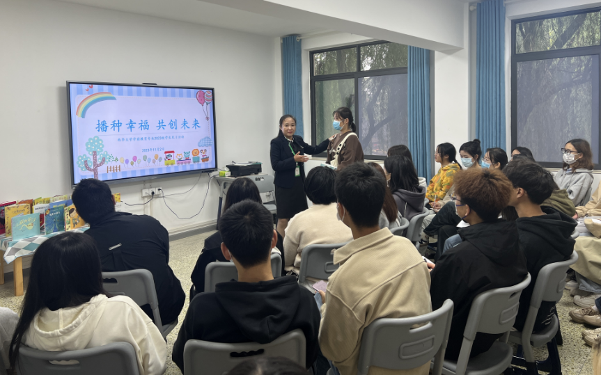 接下来,同学们来到会议室,进行了以“播种幸福,共创未来”为主题的座谈会,兰园长向同学们介绍了幼儿园的基本情况和发展规画,同学们观看了幼儿园精心制作的视频和内容丰富的照片,了解了幼儿园的常规保教及大型活动。兰园长结合《3-6岁儿童学习与发展指南》,让同学们初步明白探寻幼儿生命成长规律对于幼儿教师的专业成长是非常重要的,幼儿的学习方式主要不是通过书本、通过记忆大量抽象的符号来学习,游戏是幼儿极有意义的学习过程和学习方式,幼儿自己的生活是其学习的最重要的途径。绘本是幼儿的阅读工具,兰园长借助绘本《妈妈发火了》和《石头汤》让同学们体验到了“小绘本”里也有“大智慧”。最后,同学们带着“我为我的人生做选择,我为我的选择负全责”的思考离开了幼儿园。