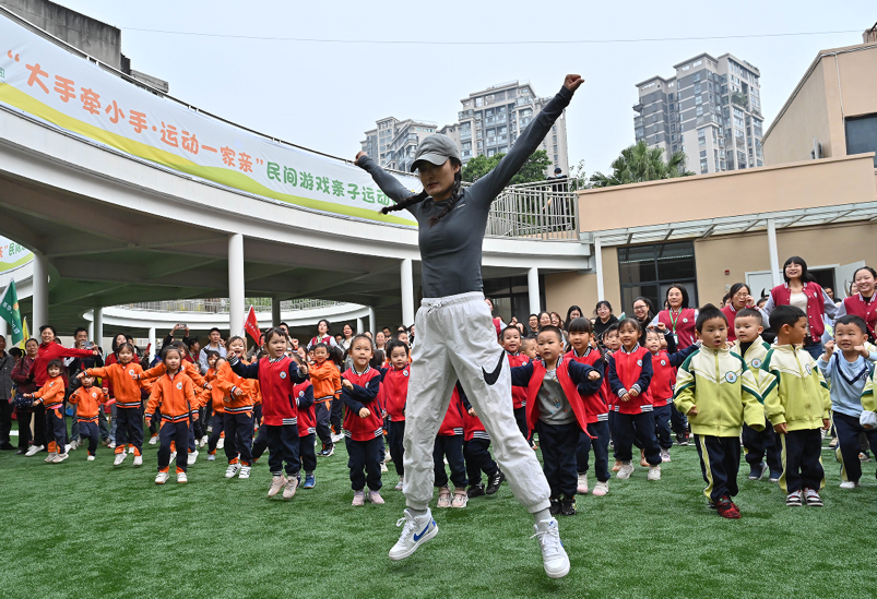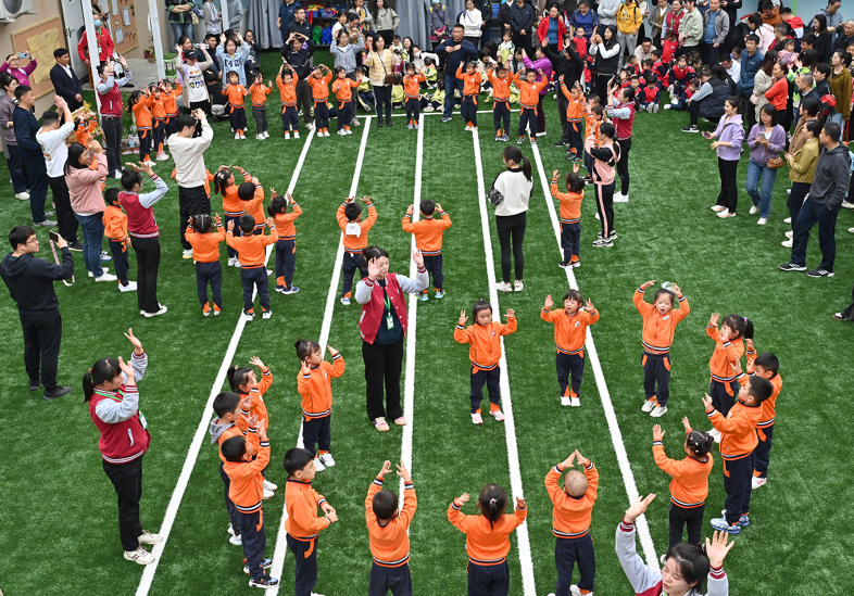 接下来,各个年级组的孩子们依次进行民间游戏特色早操的展示。在老师的带领下,孩子们活力满满,在表演中充分展示自我,同时也体现了幼儿园将民间游戏融入早操的特色。伴随着欢快的律动音乐,幼儿和家长共同快乐舞动,进行运动之前的热身活动,他们神气十足,脸上洋溢着自信的笑容。
