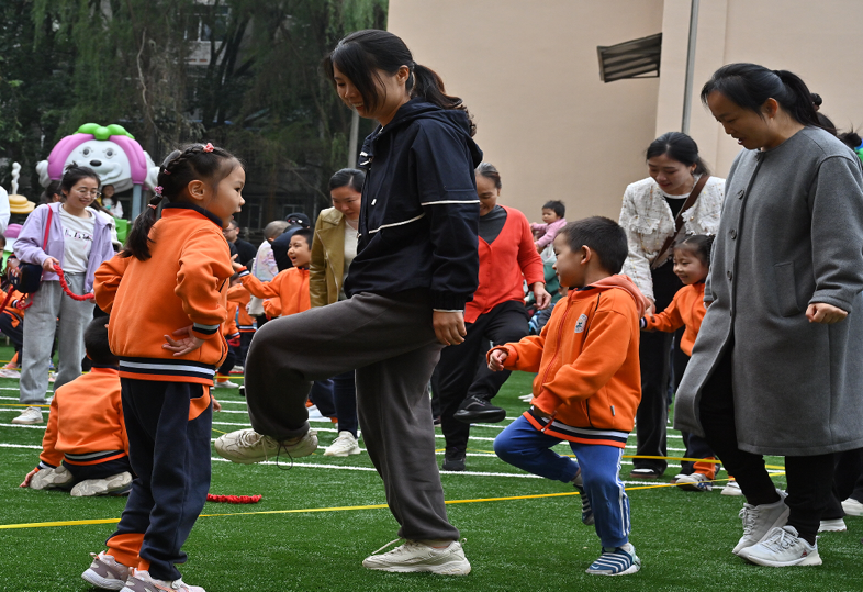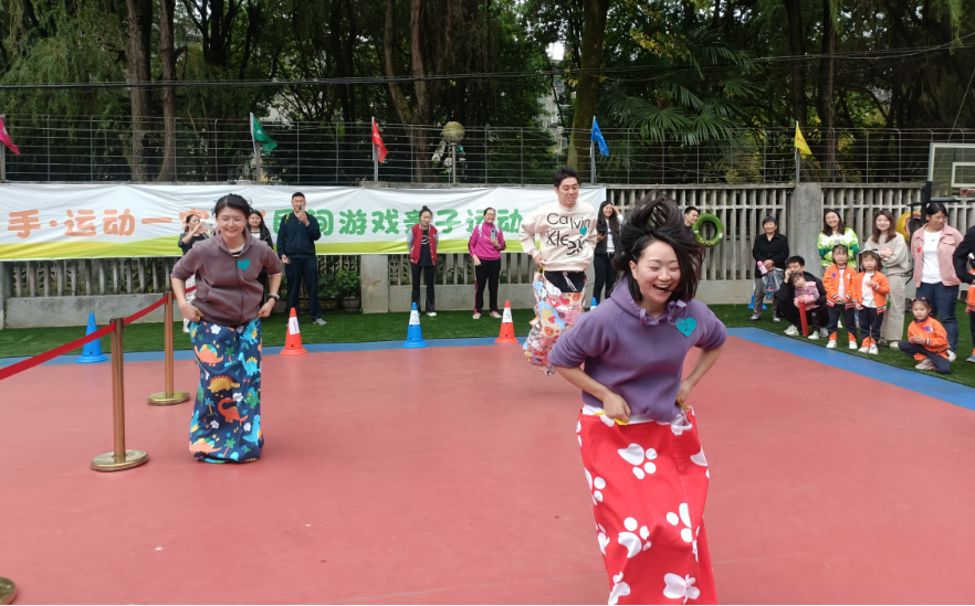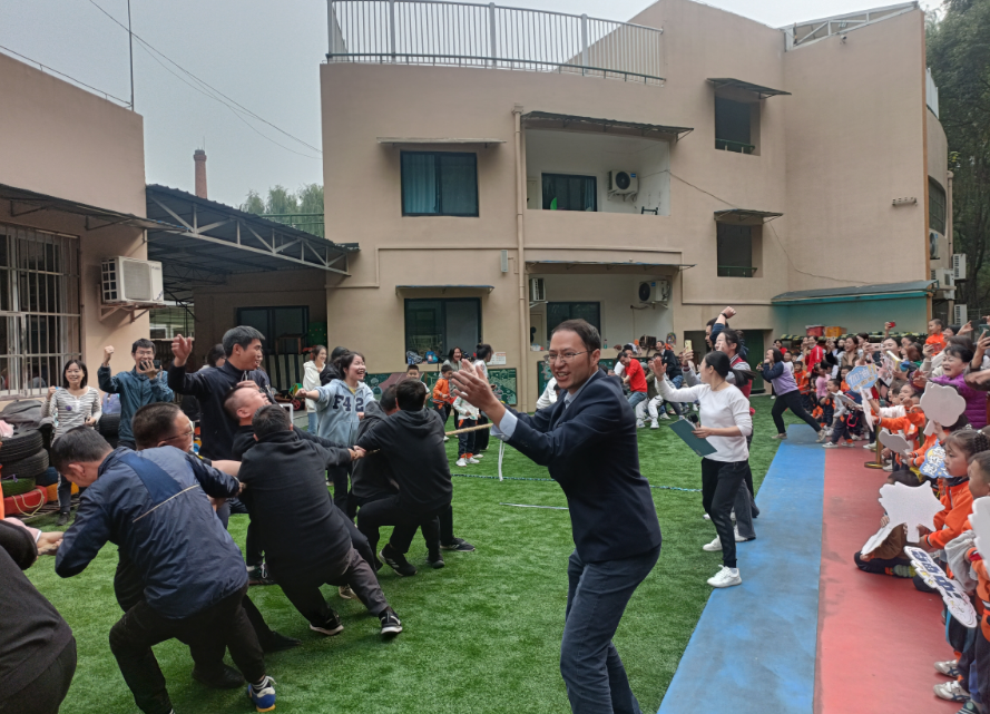 赛场上,推鸡公车、揪尾巴、袋鼠跳……大运动员和小运动员们都不甘示弱,个个奋勇争先,努力拼搏。操场上加油声、呐喊声、欢呼声交织,汇聚成一片欢乐的海洋。