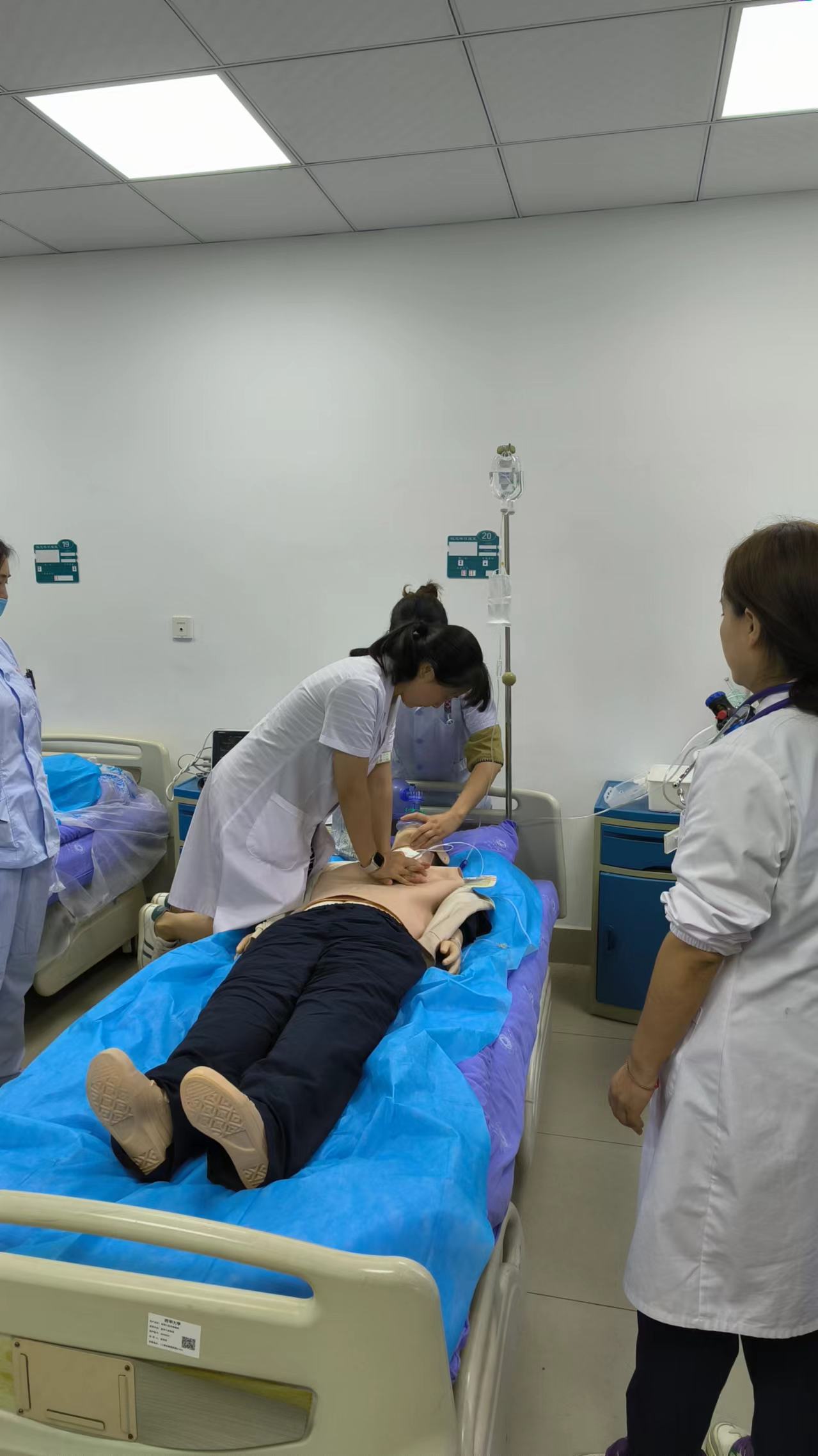 演练开展。按照预设的急救程序,医护人员迅速行动,根据不同场景判断病人急救措施,迅速展开抢救工作。演练操作包括心肺复苏、AED使用、简易呼吸气囊使用以及静脉输液、静脉给药、肌注、心电监护、监测生命体征等。演练过程紧张急促,又分工有序,他们行动迅速、配合默契,各项操作稳、准、快,医护人员过硬的专业技能和良好的团队能力得到充分展现。