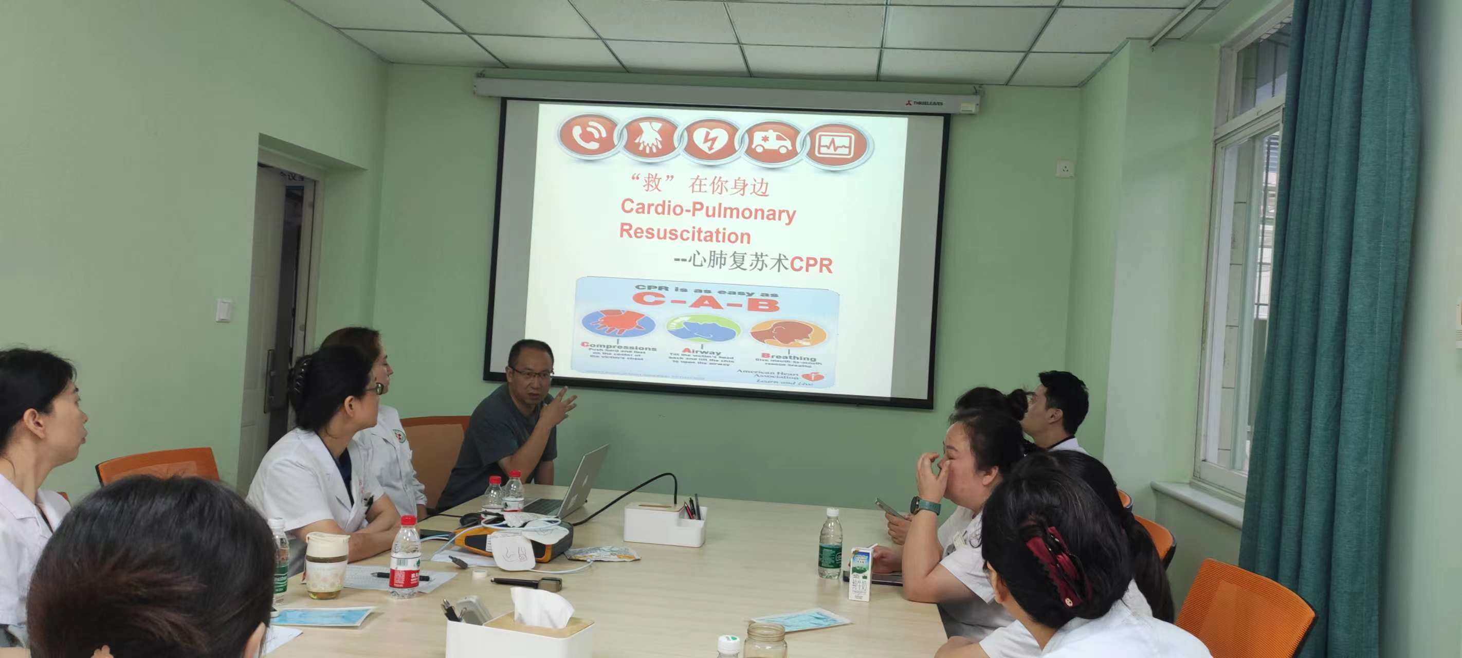 演前培训。谭建军院长着重讲解“黄金四分钟”的重要性,内科吴茂芳医生就相关核心技术和操作要领为全院医护进行了理论和操作培训。