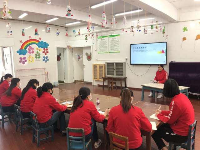 4月24日下午,幼儿园老师们相聚在园内,一起聆听王爱萍老师带来的金牛区幼儿园表演游戏研究联盟培训和周婷婷老师精心准备的金牛区教育局幼儿园童年游戏故事初讲。活动中,王爱萍就表演游戏的概念、流程和故事的选择要素向大家做了详细介绍;周婷婷以民间传统游戏为主题,结合精美的幻灯片和轻柔的背景音乐把老师们带入到故事情节中,仿佛又回到了快乐的童年。老师们认真学习记录王爱萍分享的知识,对区域表演游戏有了新的认识;对周婷婷老师的故事表演表示肯定并提出合理建议,希望她接下来更加努力,争取在此次比赛中获得优异成绩;活动结束后,幼儿园园长兰利发表讲话,她对老师们热爱学习的精神给予鼓励和赞扬,希望老师们把这份热情继续保持下去,同时对老师们提出了更高的要求和标准,以便让幼儿园的孩子们接受与时代同步的优质学前教育。