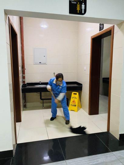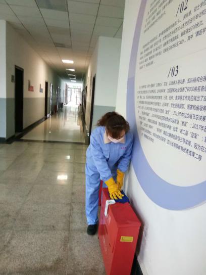 保洁正在对教学楼进行清扫消毒工作