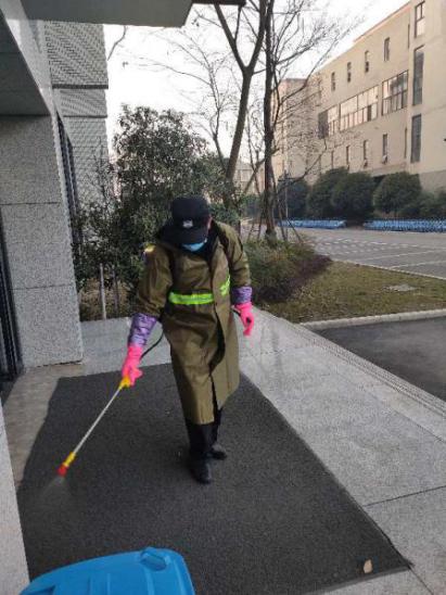 中心秩序维护队员正在对电梯间及教学楼消毒