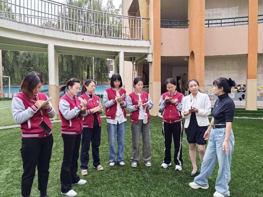 张云园长一行深入户外游戏现场,对幼儿园游戏区域设置、环境创设、幼儿自主游戏开展、材料投放等方面进行实地观摩,对幼儿户外自主游戏活动和园所环境创设等方面进行了全面细致的分析,及时有针对性的进行现场指导。