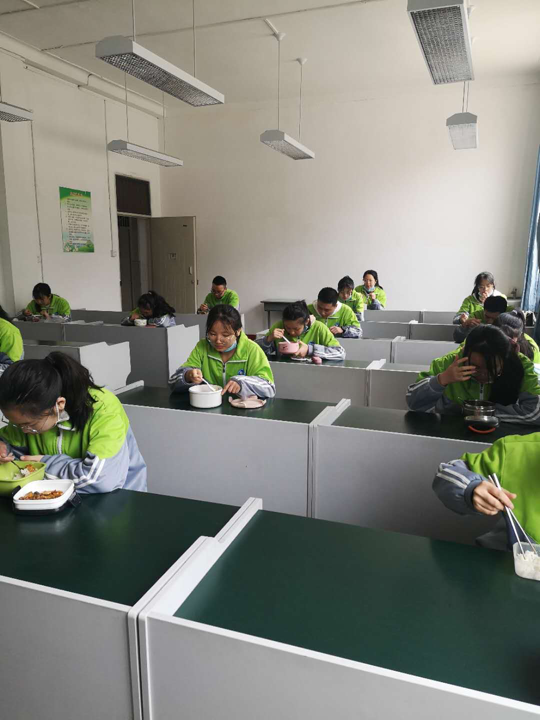 为防止和阻断疫情进入校园,确保师生健康安全,学校采取全封闭式管理,午间学生在校内就餐,不得离开学校。初三年级34名学生分为两个教室错峰就餐,餐后由值班老师统一管理进行午自习。