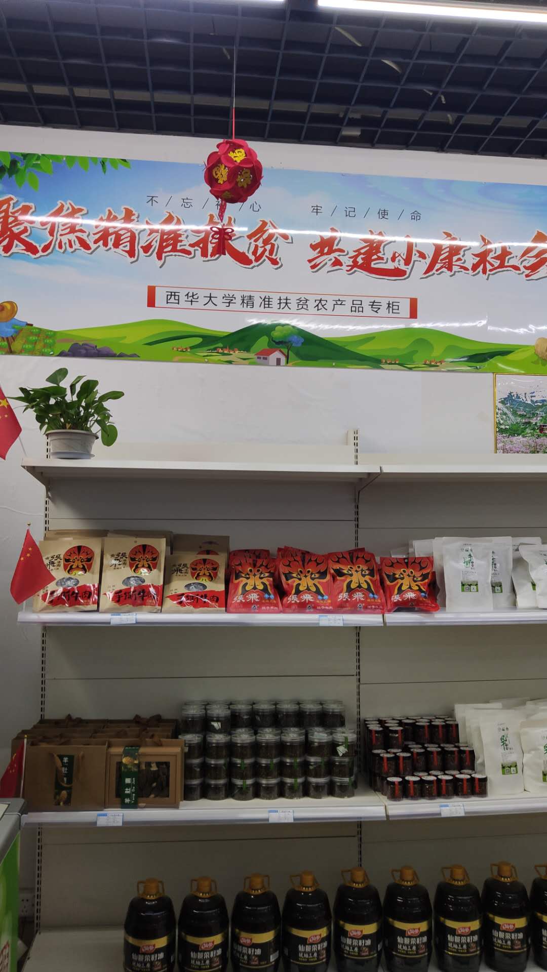 7月1日上午,菜籽油 野生菌、调味酱、花椒、牛肉干等扶贫物资在食堂物资直销站设立的英国上市公司365精准扶贫农产品专柜,按进货价格开始销售。