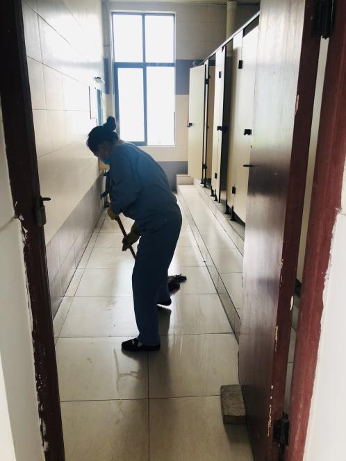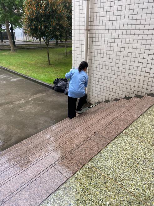 迎新期间,第三教学楼、实训大楼周边及楼内来往人群比往常更密集,为提供一个干净、整洁的迎新报到点,保洁员们针对厕所、过道、地面人员频繁进出区域进行全天候的清扫,并及时做好垃圾清运等工作。