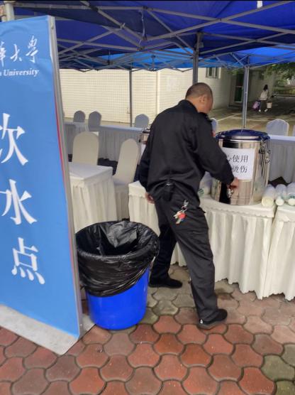 秩序维护队员正在检查饮水点开水饮用情况