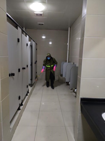 保洁人员正在对卫生间和玻璃进行清洁工作