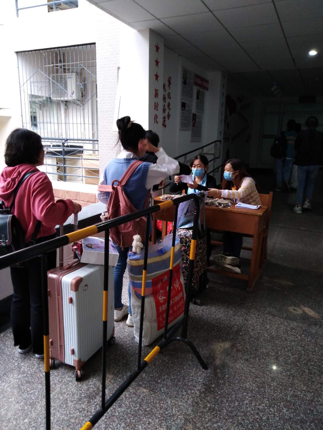 迎新当天,中心员工以饱满的热情欢迎新同学的到来,新生有序入楼领取寝室钥匙、消毒工具,工作人员耐心引导,新生同学们积极配合,宿舍迎新秩序井然。同时宿舍管理员还在宿舍楼内监督巡视,为新生指路、搬物,并对违规散发宣传物者,进行了及时制止和驱离,较好地维护了迎新现场的工作秩序;保洁人员及时对楼栋垃圾及湿漉的楼梯、地面进行清洁,防止摔滑,确保宿舍环境干净、整洁、温馨;各苑区工作人员的热情服务让新生真切感受到了家的温暖。
