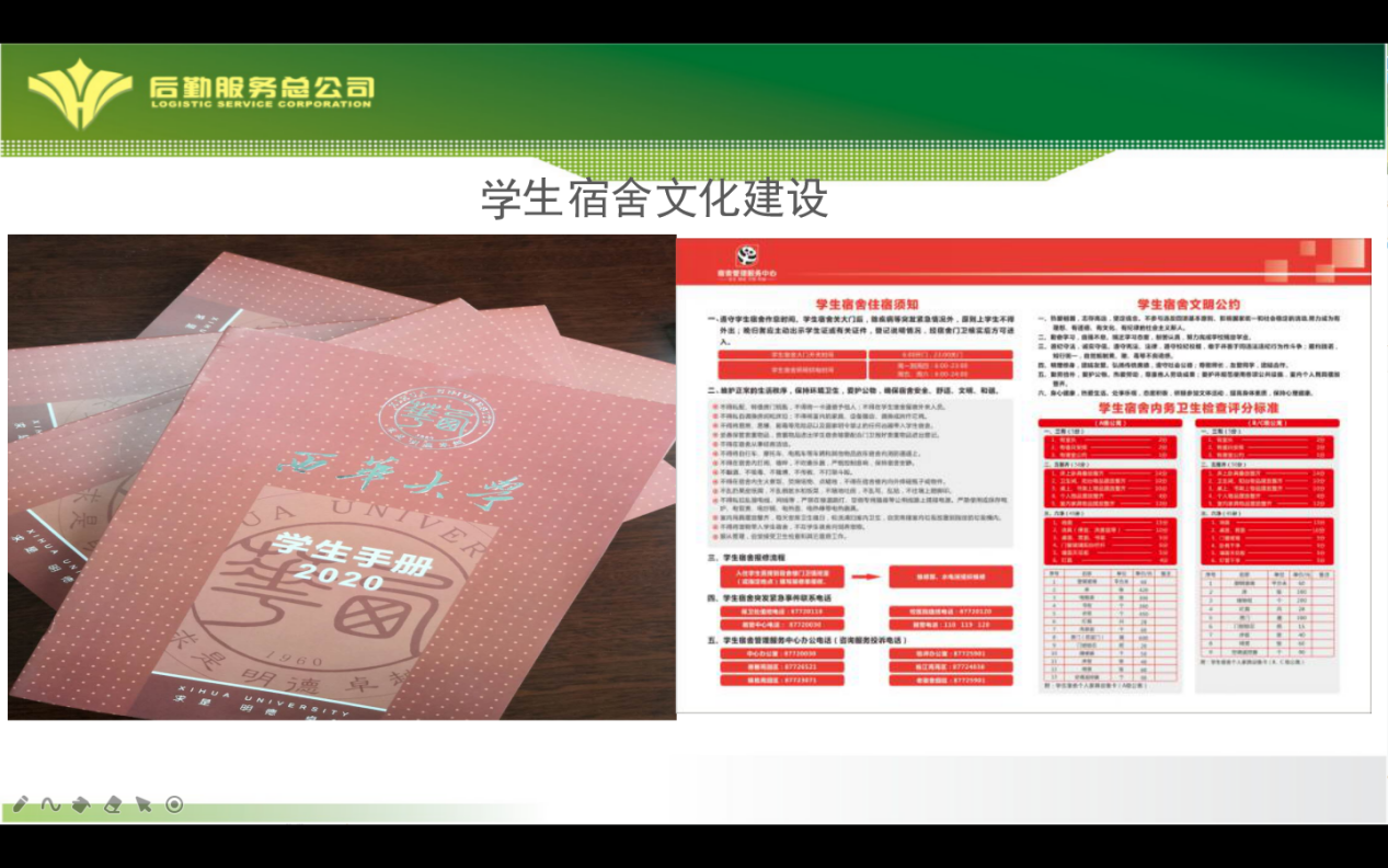学生宿舍文化建设、学生宿舍相关办事流程以及今年学生宿舍疫情防控常态工作也是此次入学教育的重点内容。在宿舍文化建设板块,同学们了解到为改善老宿舍区居住条件,学校每年更换老宿舍区家具设备;知晓了《2020学生手册》学生宿舍相关的管理制度及重点内容;了解到学生宿舍垃圾分类下楼以及寝室人际关系处理等等;在学生宿舍相关办事流程板块,老师们将宿管中心的多个信息沟通渠道告知同学们,引导学生要积极地通过正规渠道与宿管中心进行沟通,有任何情况第一时间和宿管中心联系处理;学生宿舍疫情防控常态工作板块,向同学们详细介绍了宿管中心开展的防控工作,同时也呼吁同学们加入我们,一起防疫。
