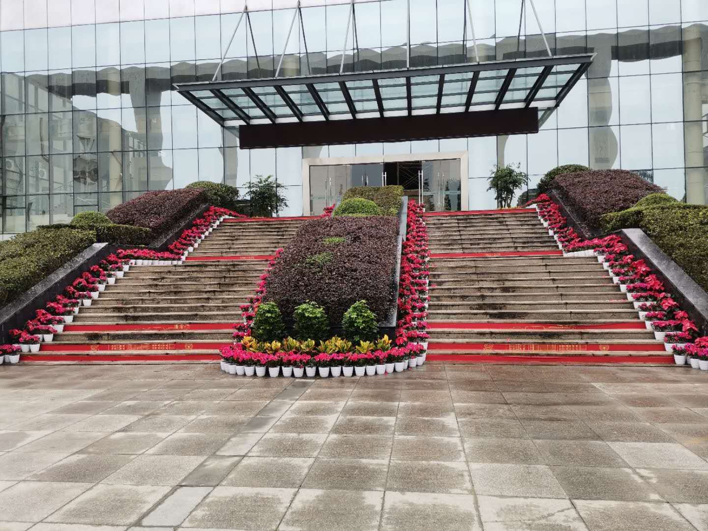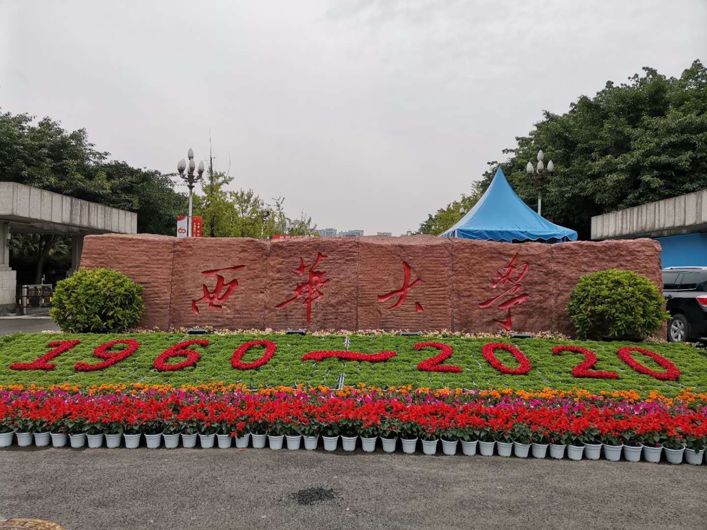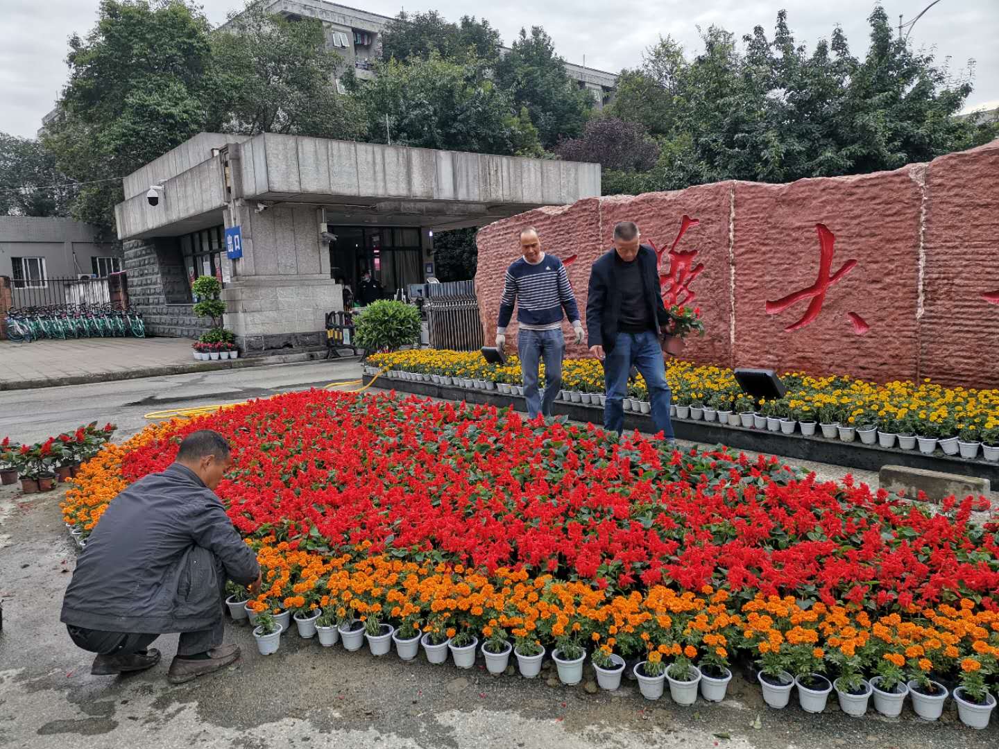 绿植装扮,彰显校园魅力。根据校庆接待方案,本次校庆活动需要在学校大门、行政楼、大剧场等重点区域摆放绿植,此次绿植摆放工作时间紧、任务重,中心员工团结一致,经常忙至深夜,经多次调整方案,才最终达到预期效果。如大剧场前门初步方案是将全部绿篱移除后更换为鲜花,经商议后在保持现状下在楼梯口增摆鲜花。同时,在南大门栽种了“1960-2020”立体鲜花大字等,使得校园的美化效果得到提升,笼罩了浓厚的校庆氛围。