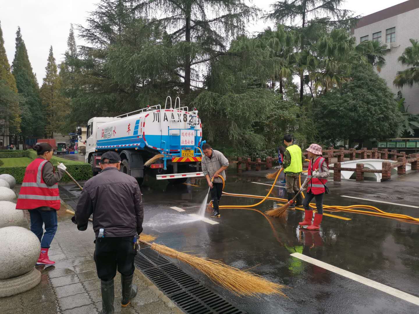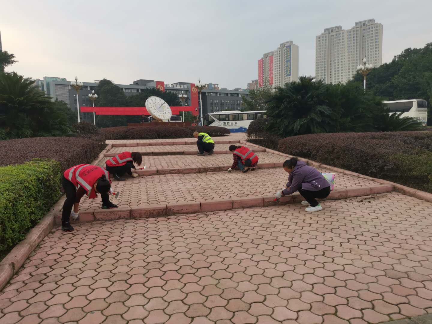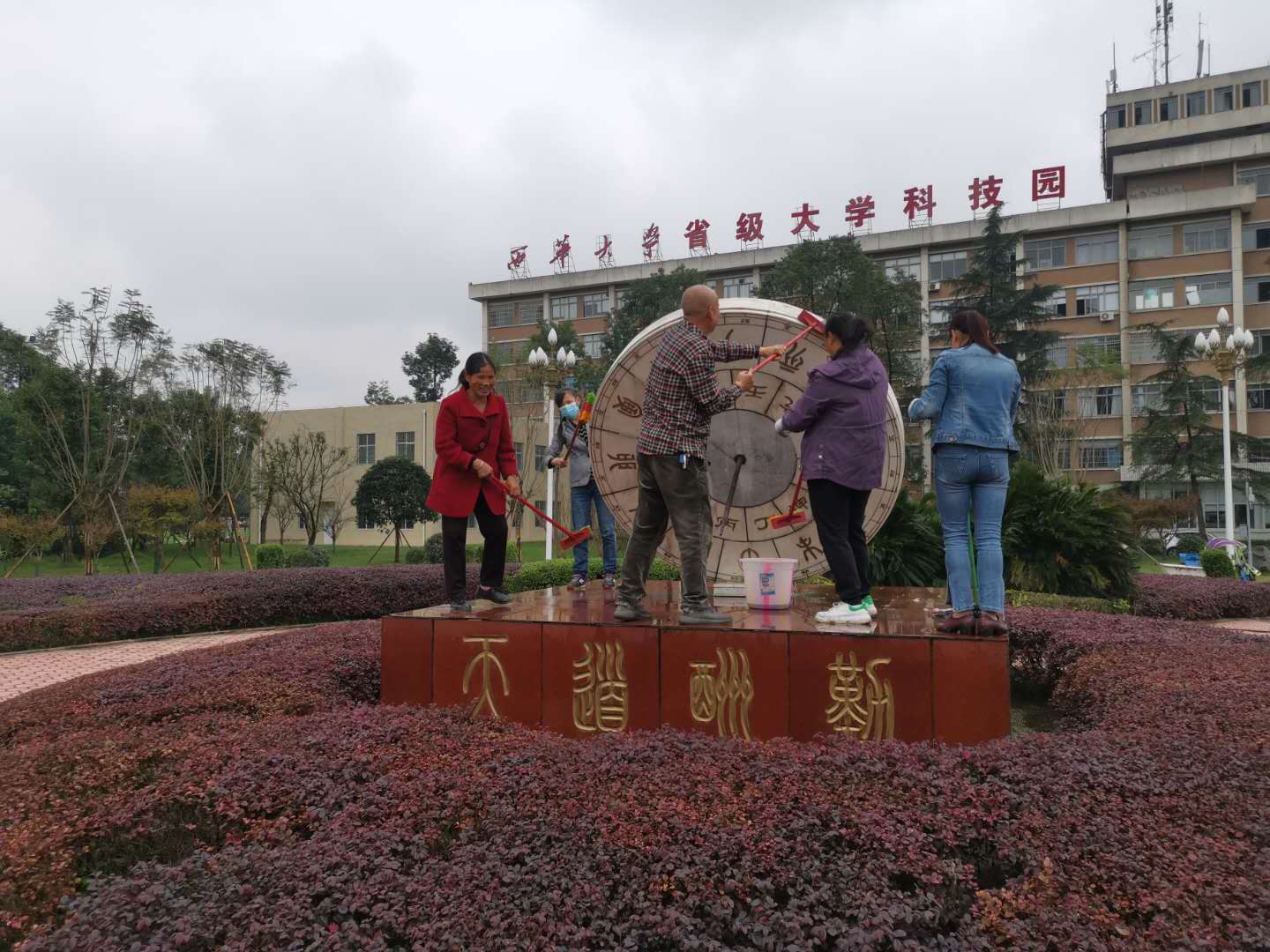 统筹部署,打造干净校园。为了以更加整洁美丽、和谐温馨的校园环境迎接校友和嘉宾,中心以校庆为契机,对公共环境卫生进行综合大整治,高效推进卫生工作。三教求是广场日晷及周围地砖锈迹灰尘较多,清理难度大,中心积极开动脑筋、想办法,迅速组织工人们用钢丝球、刷子等进行打扫,一块砖一块砖地进行仔细清理,使其焕然一新,达到最佳效果。同时,中心积极推进清洗校园路面、清除卫生死角及牛皮癣、管理公共厕所及垃圾桶等各项工作顺利开展,高标准、严要求,责任落实到人,确保完成效果。