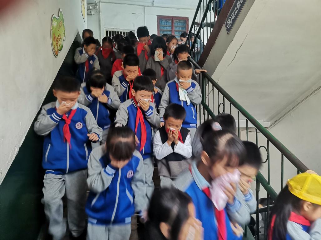 随着警报声响起,班主任、各区域负责人立即到达各班级,组织师生们按照要求用湿手帕、毛巾捂住口鼻,弯腰快速前行,按照预定安全路线快速、有序地从教室撤离至操场。整个演练过程既紧张又有序,教师认真负责、学生密切配合,实现了全员安全疏散。从警铃拉响到全校479名师生安全疏散用时4分,中途没有发生拥挤、推搡等不安全现象,达到了演练的目的。