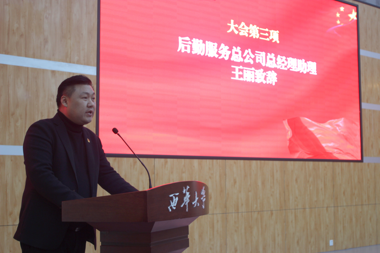 大会以师生共同奏唱《光荣啊,中国共青团》,观看团委宣传视频拉开序幕。总经理助理王丽致辞,他首先代表总公司党委向志愿加入后勤、热爱后勤、奉献后勤的同学们表示衷心的感谢,他表示,2019-2020学年团委积极发挥在学生与后勤服务间的桥梁纽带作用,先后开展了10余个后勤特色活动,在公司新媒体宣传、日常管理与服务、公寓文明与安全、服务满意度提升、志愿者服务、安全知识宣传普及等方面做出了突出贡献。同时,他对全体学生干部干事提出了五个要求,一是要加强政治建设,坚定理想信念;二是要加强作风建设,重视自身修养;三是要努力勤奋学习,夯实专业基础;四是要热心为同学服务,关心他人,以身作则做好青年学生干部的表率;五是要志存高远、锤炼意志。