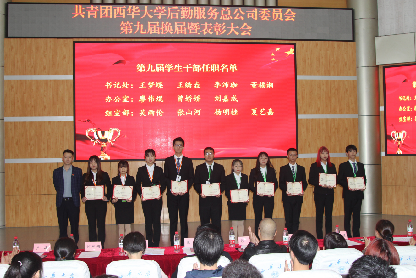 会上,党政办公室主任谭佳宣读《后勤服务总公司团委关于表彰2019-2020学年先进集体和个人的决定》文件,她对受表彰的集体和个人真挚寄语,希望同学们珍惜荣誉,再接再厉,戒骄戒躁,在今后的学习和工作中继续发挥模范带头作用。各部门(中心)负责人在会上依次为学生干部颁发获奖证书及聘书。