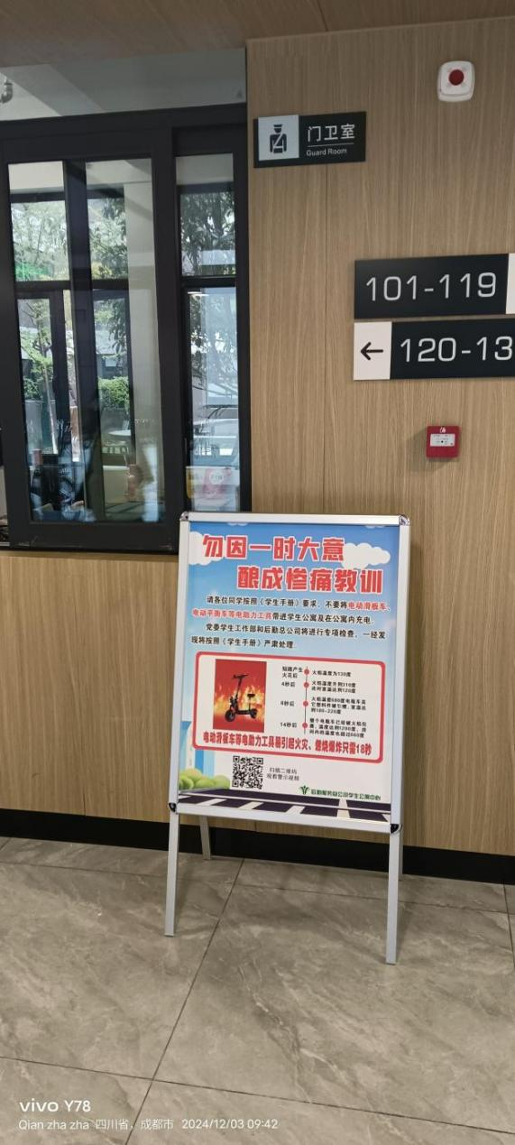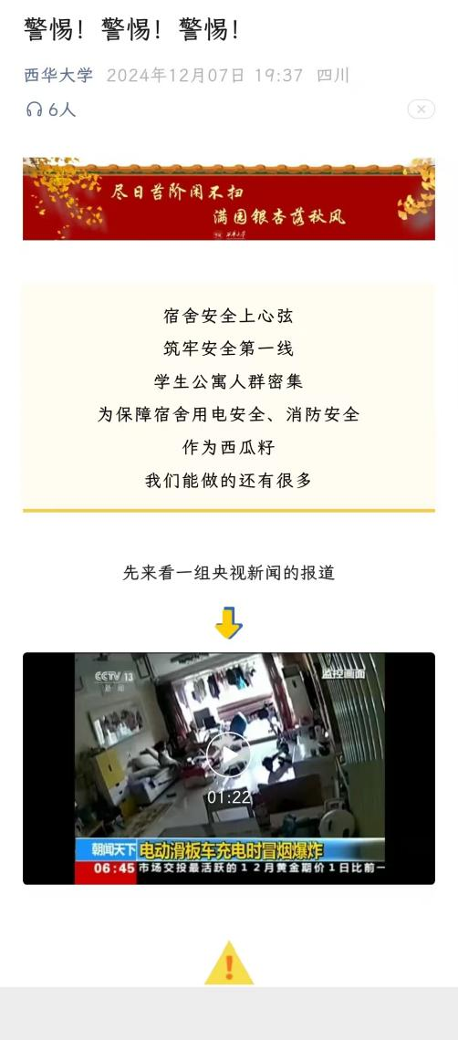 在发布通知、布置工作的基础上,党委宣传部在学校官微上推送了“电助力工具使用安全教育”的相关推文,进一步普及安全知识、增强安全意识,筑牢师生员工安全思想防线。学生公寓中心统一制作了“勿因一时大意、酿成惨痛教训”的宣传海报,针对性地介绍电动滑板车等电动工具引发火灾的警示教育视频,并安排公寓管理员向学生做好宣传教育和劝阻工作。
