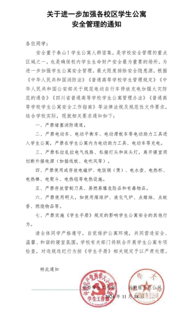 为进一步强化学生公寓安全管理、排除安全隐患,在党委宣传部、党委学生工作部的大力支持下,后勤服务总公司联合学工部于11月18日发布了《关于进一步加强各校区学生公寓安全管理的通知》,严格管理电动滑板车、电动平衡车进出学生公寓。学工部随即召开学工系统专题会议布置相关工作。