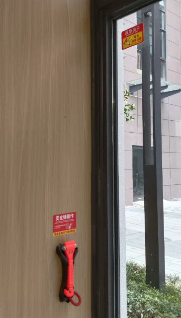 针对可能发生的紧急情况,对学生公寓楼一楼的出入口通道配置了消防安全锤96套,张贴操作指南和标明敲击点位,确保在应急状态下使用安全锤迅速精准的敲碎玻璃,为学生开辟逃生通道,迅速疏散撤离。
