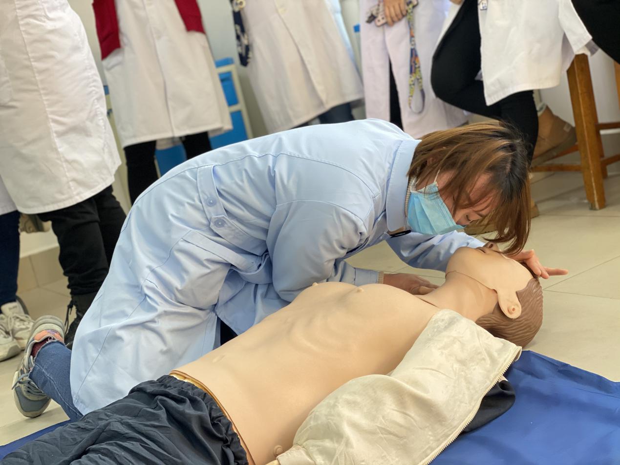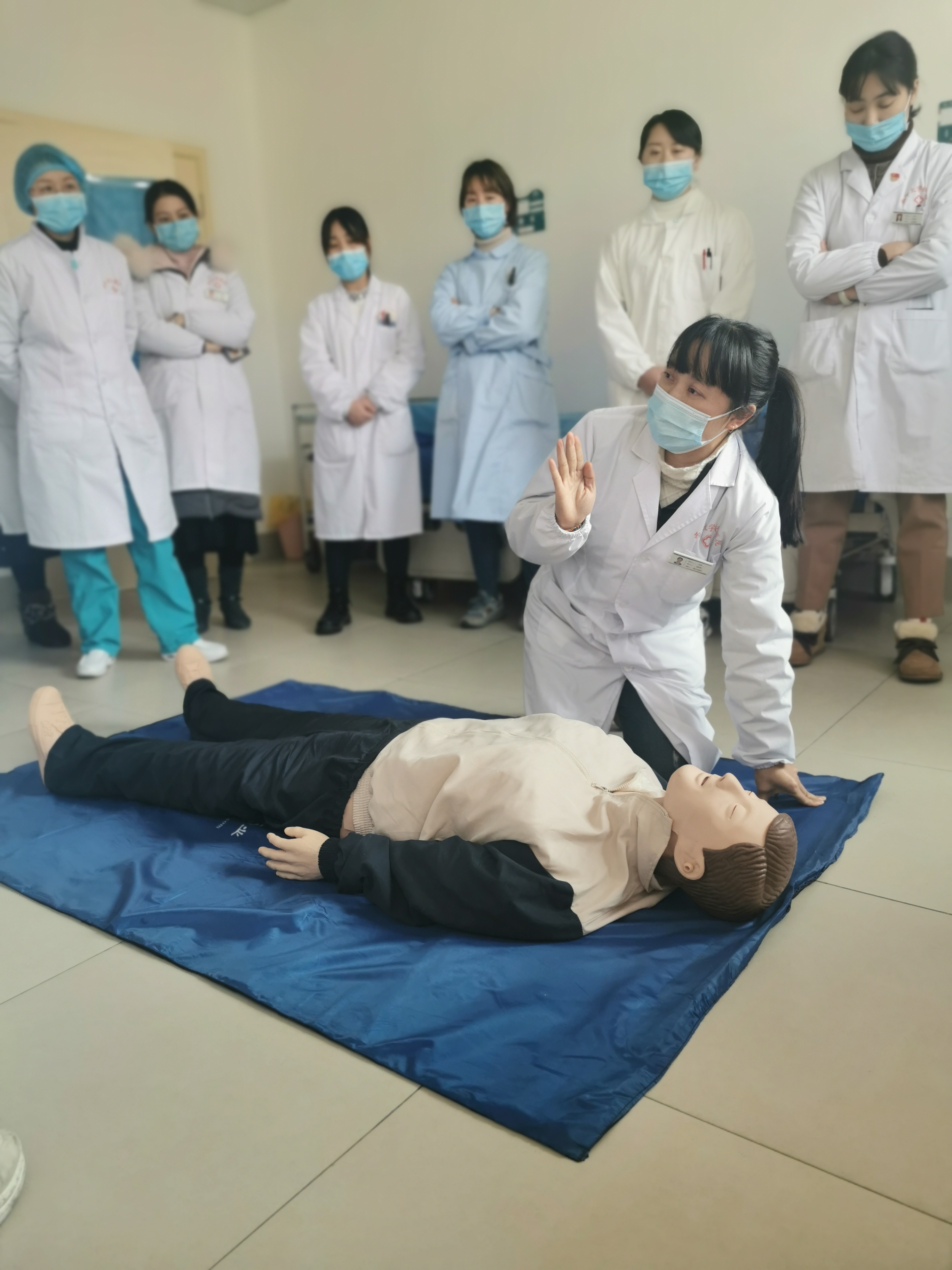 首先吴敬副主任医师从新冠肺炎传播途径、患者人群分析等方面讲解,为大家更新了新冠肺炎疫情防控知识,紧接着从心肺复苏新增环节、开放人工气道方式、新增急诊药物使用等为方面为大家详细讲解了急诊急救最新内容。随后彭燕副主任医师在现场使用模拟人为大家进行了心肺复苏实际操作,并重点讲解了心肺复苏中各操作要点和可能出现的问题。最后郁晓燕副主任医师督导每位医务人员均进行了实际操作,并进行点评、指导和考核。