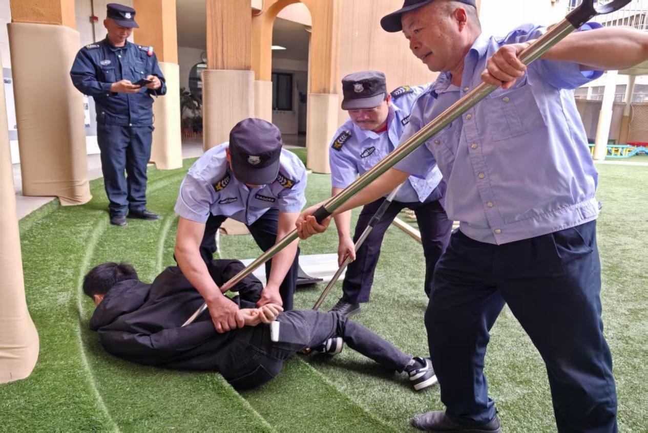 场景逼真,处置有力。上午10:20,演练正式开始。一名警官扮演的“歹徒”假借家长给孩子送衣服的名义,强行闯入了幼儿园。保安人员迅速反应,立即拉响警报,并持防暴器械与“歹徒”周旋。听到警报声,老师们迅速组织户外活动的幼儿撤离至最近教室或安全区域,锁闭门窗,用重物抵住门框;室内活动的幼儿在老师指挥下躲藏在桌下、墙角等隐蔽位置,保持安静。幼儿园应急小组迅速集合,携带防暴装备赶到现场,与保安协同作战,成功制服“歹徒”。