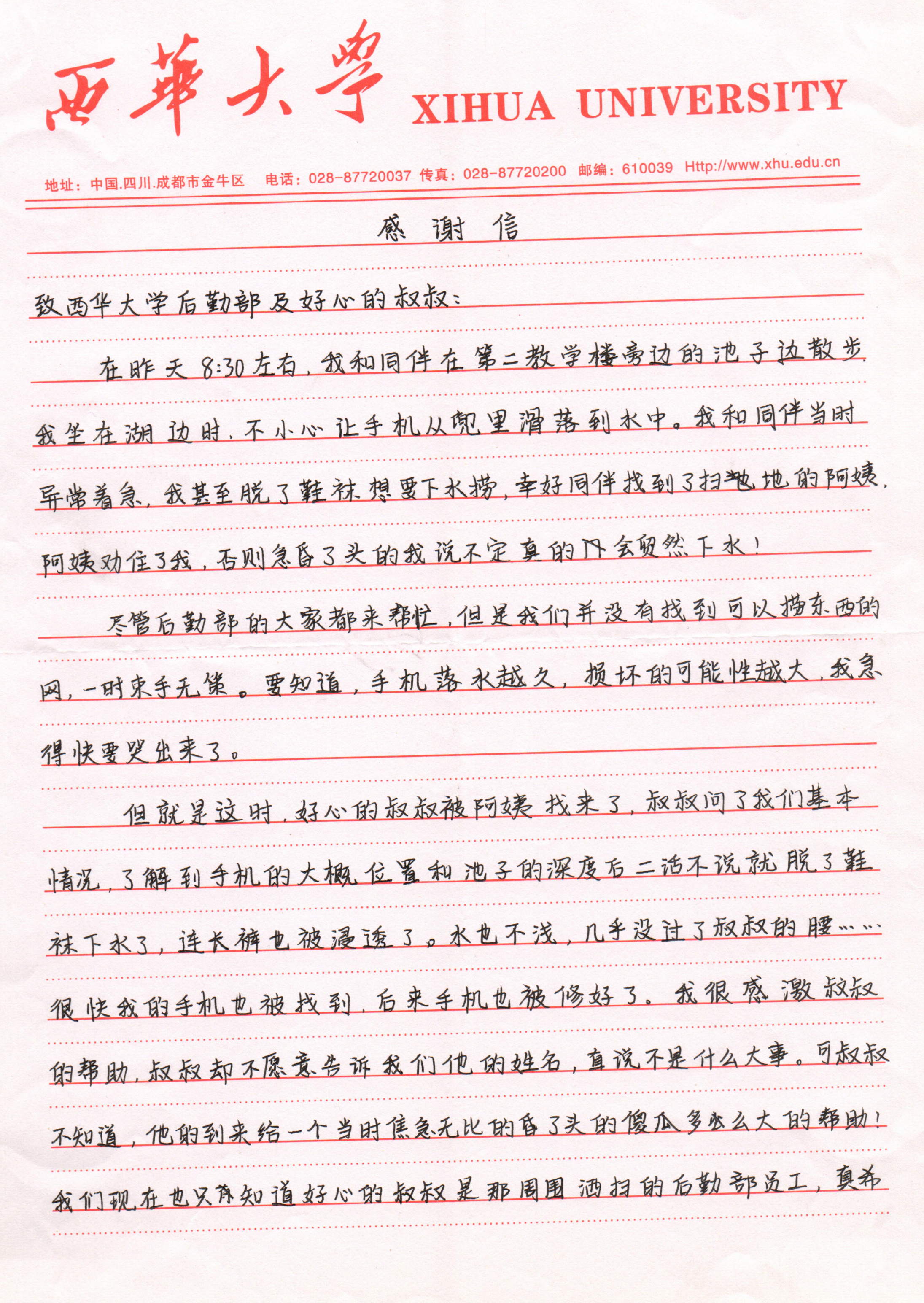丁恬同学在手机失而复得后非常感动,她非常感谢这位好心的后勤绿化叔叔,但她却不知道帮助她的叔叔叫什么名字,事后她主动联系到后勤服务总公司,通过感谢信向助人为乐的叔叔表达感谢,她的信中这样写道:“向后勤的叔叔表示感谢,也许对你们来说真的只是一件小事,但就是因为你们乐于助人的精神,让我感受到了西华后勤的可靠和温暖!感受到了西华的人后勤员工的正能量!叔叔、阿姨,谢谢你们、爱你们……”,后经后勤服务总公司核实,帮助丁恬同学捞出手机的员工系公司绿化工人钱在明。