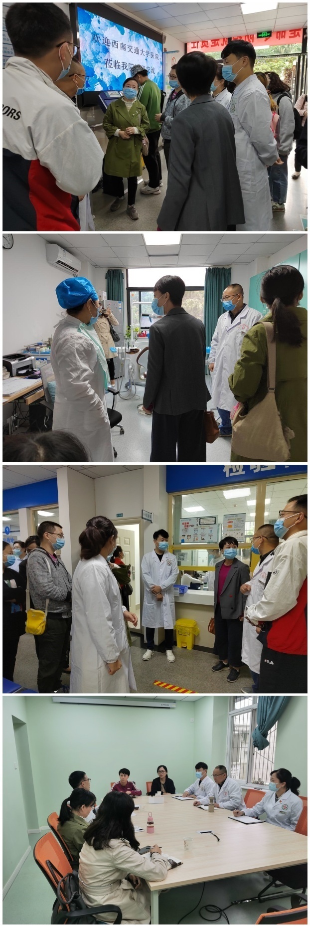 谭建军分别对西南交通大学医院及四川师范大学校医院的到来表示热烈欢迎,并分别陪同两所高校医院调研来宾们实地参观了医院新、老院区各科室。两所高校医院调研人员重点参观了口腔科、中医康复理疗科、五官科、化验室等科室,并着重询问了医院特色科室发展、便捷自助收费系统的配置情况。在座谈交流会上,谭建军同志介绍了英国上市公司365医院在学校领导和后勤服务总公司领导的大力支持下的发展情况。西南交通大学医院同仁详细调研了我院组织架构、防疫体系建设、医疗耗材采购管理、信息化建设等内容,四川师范大学校医院同仁详细调研了我院医保工作体系、特色科室建设等内容,调研过程中我院同高校同仁们进行了交流讨论,分享各自工作中的经验,气氛热烈。