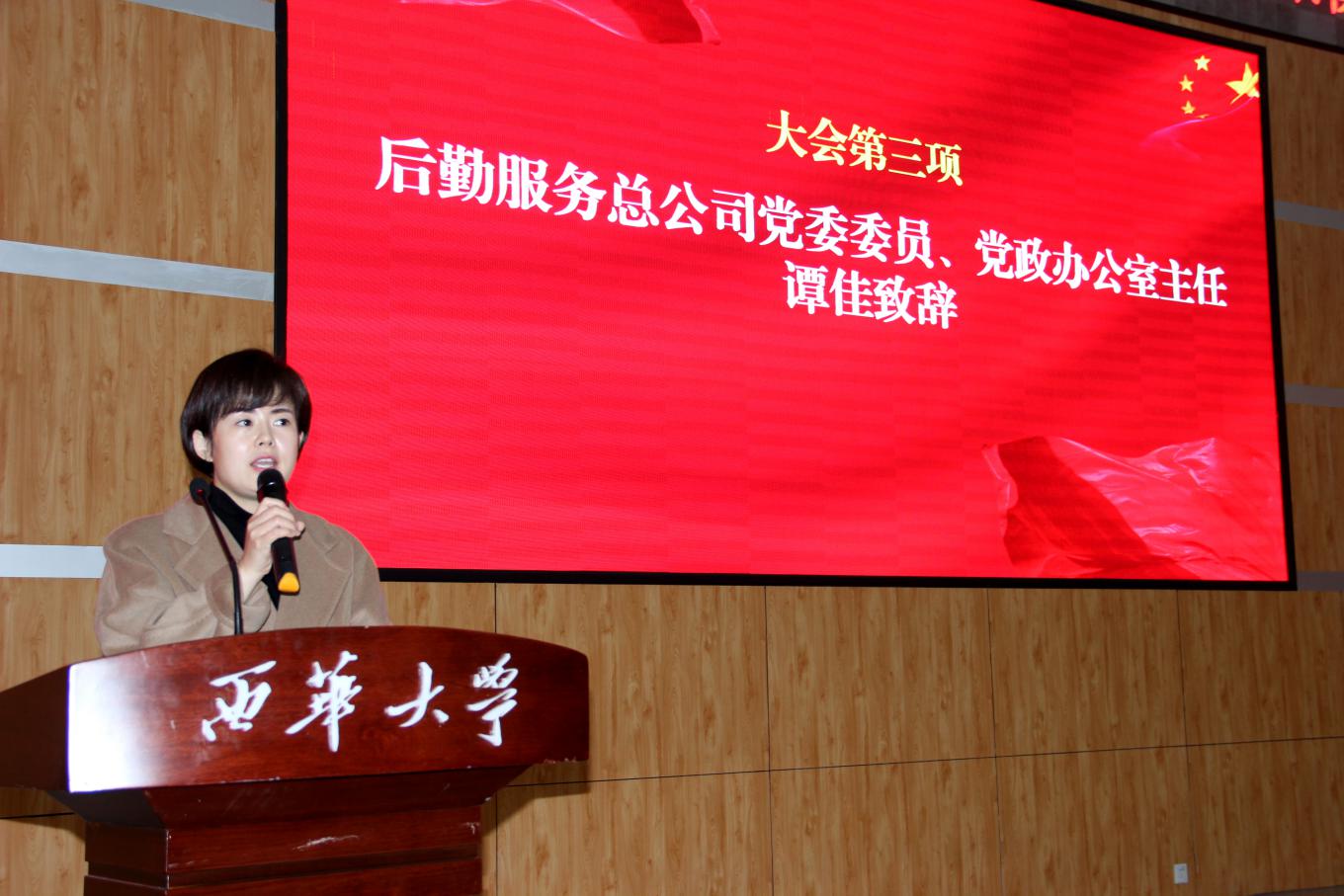 大会以师生共同奏唱《光荣啊,中国共青团》,拉开序幕。办公室主任谭佳致辞,她代表公司党委向志愿加入后勤、热爱后勤、奉献后勤的同学们表示衷心的感谢和热烈的欢迎。她表示,本学年公司团委积极发挥在学生与后勤服务间的桥梁纽带作用,先后开展了“走进后勤,体验后勤”、光盘行动、119防火安全宣传、寝室全家福、食品安全宣传、节能节水进校园等10余个后勤特色活动,成效显著,有力地推动了后勤服务文化的建设。