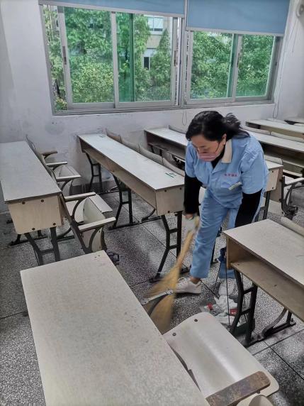 由于本次学士学位外语水平测试在周六举行,参考的学生400余人,考试场地涉及第三教学楼多个区域,加之疫情形势严峻,中心为此提前谋划,积极落实相关举措。一是安排保洁人员加班加点开展楼内外清洁,有计划,有针对性地对教学楼难以祛除的墙壁污渍、桌椅字迹以及考场周边、楼内小广告进行彻底清理;二是谨遵学校疫情防控要求,严格做好公共区域及教室“一考一消”的作业模式,卫生间全部摆放洗手液,于显眼处张贴“本区域已消毒”标识;三是做好人员在岗,服务在线。考试当日早上6点30分,中心消杀人员及保洁人员提前到岗,主动放弃休息全力做好教室清洁消杀工作,给有需要的考生及监考老师提供暖心贴心的服务。