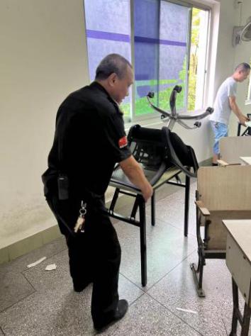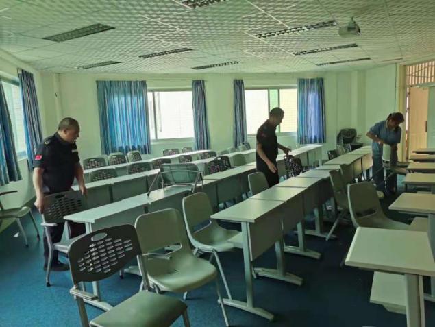 秩序维护及保洁人员正在搬运桌椅及打扫教室卫生