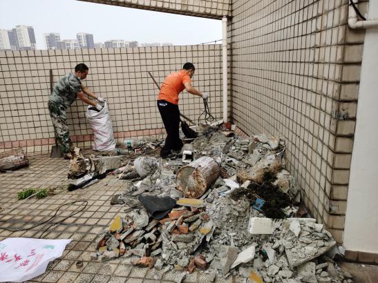秩序维护队员正在清理楼顶建渣、杂草