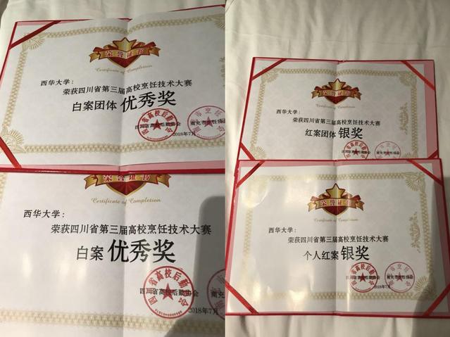 比赛当天,我校饮食服务中心4名选手与来自川内的20余所高校,200余名“食匠”同场竞技。他们以沉着冷静的表现、娴熟自如的技术、精巧细致的作品得到了现场评委的一致好评。经过大赛组委会严格评审,最后我校获得评委的一致认可,以优异的成绩斩获“红案团体银奖”、“ 红案个人银奖”、“白案团体优秀奖”、“白案优秀奖”4个奖项。