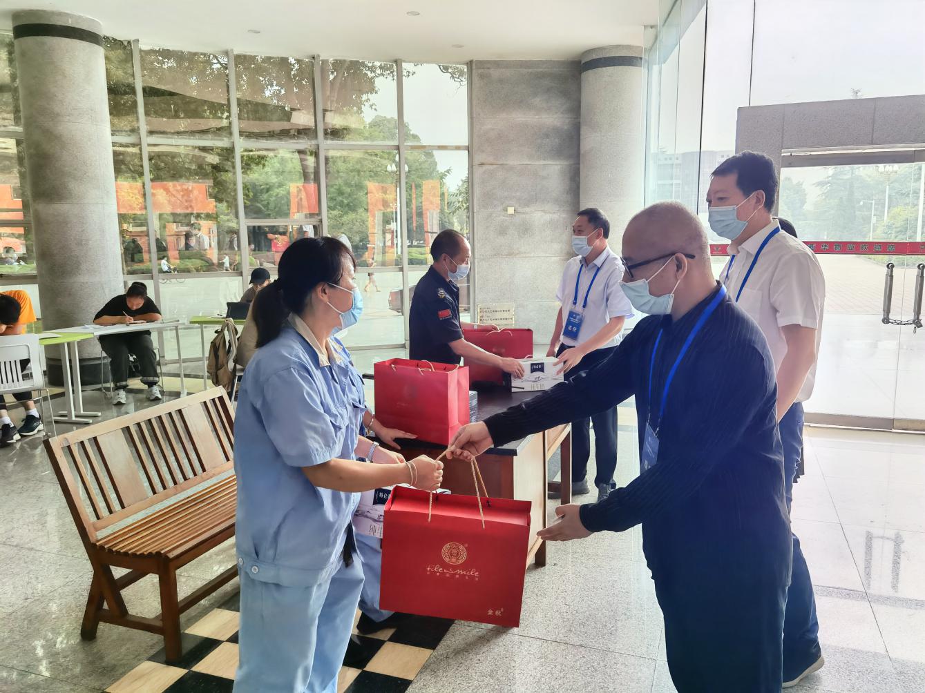 9月10日上午,在教师节、中秋节到来之际,校领导带领党政办、宣传部、学工部、后勤服务总公司等部门负责人,分别前往学生食堂、学生公寓、教学楼、维修点、校医院等区域,看望慰问奋战在疫情防控一线的后勤服务保障人员,为他们送去学校的关心与慰问。