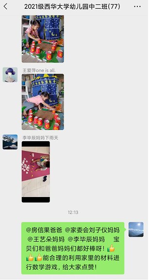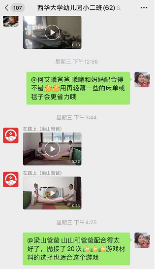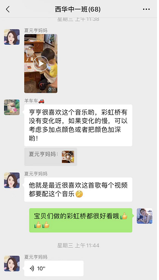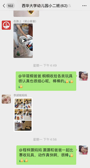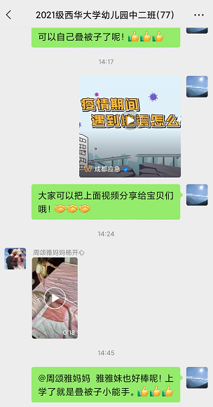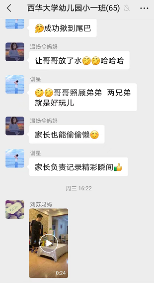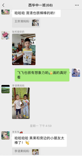 丰富多彩、科学有趣的线上育儿指导活动正在如火如荼地开展着,聪明可爱的宝贝们在爸爸妈妈地耐心引领下,经过自身地努力,圆满完成了一个又一个的小目标,知识和技能得到同步发展。折叠整齐的衣裤、干净的地板、长势喜人的绿植、色香味俱全的美食、精巧的手工作品、成功的科学小实验、与家人的趣味亲子游戏....。孩子们棒棒的表现,老师都看在眼里,甜在心里!当然,老师们的辛勤付出也收获了宝爸宝妈地积极赞许!