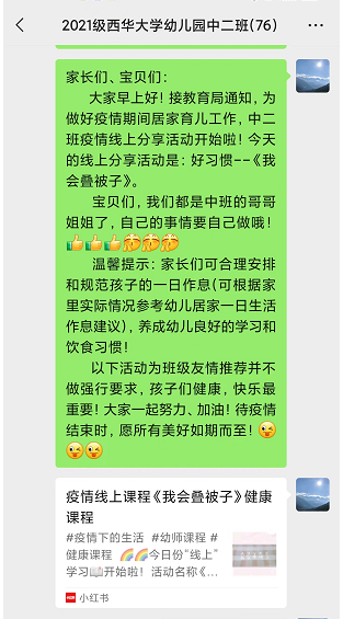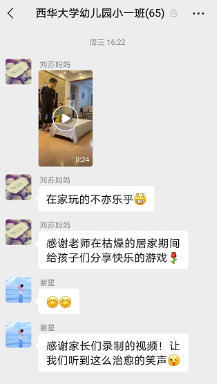 周一到周五,老师每天按时在家长群里推送以《“疫”样教学,“童”样精彩》为主题的教学内容,涵盖了健康、语言、社会、科学、艺术五大领域的目标要求,以及防疫知识、劳动技能、亲子游戏、生命安全、创建文明卫生城市等相关知识。爸爸妈妈地悉心照顾和老师地快乐陪伴,让孩子们宅家的日子“童”样精彩!