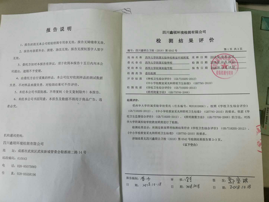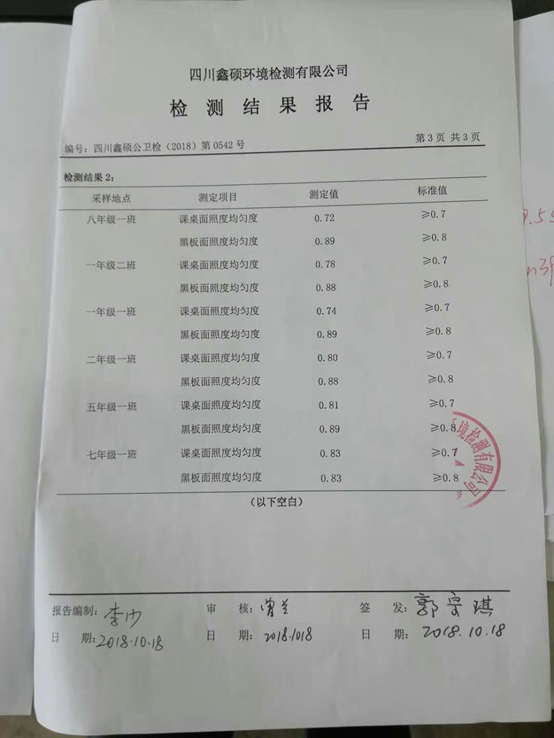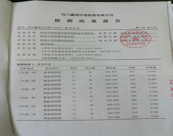 学校有关部门联系了四川蜀元建筑有限公司在十月份进行灯具装修工作,现今,学校所有教室的灯具已全部更换。四川鑫硕环境检测有限公司依据《学校卫生综合评价》和《中小学教室采光和照明卫生标准》对我校新装修的灯具进行了检测。报告显示,各个教室在新装修后课桌面照度、黑板面照度、课桌面照均匀度、黑板面照均匀度都已达到合格标准。