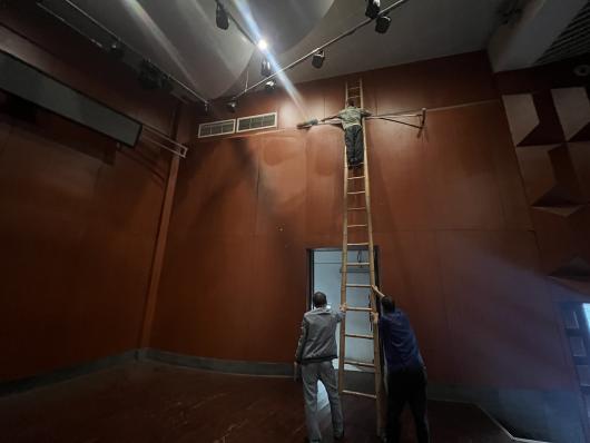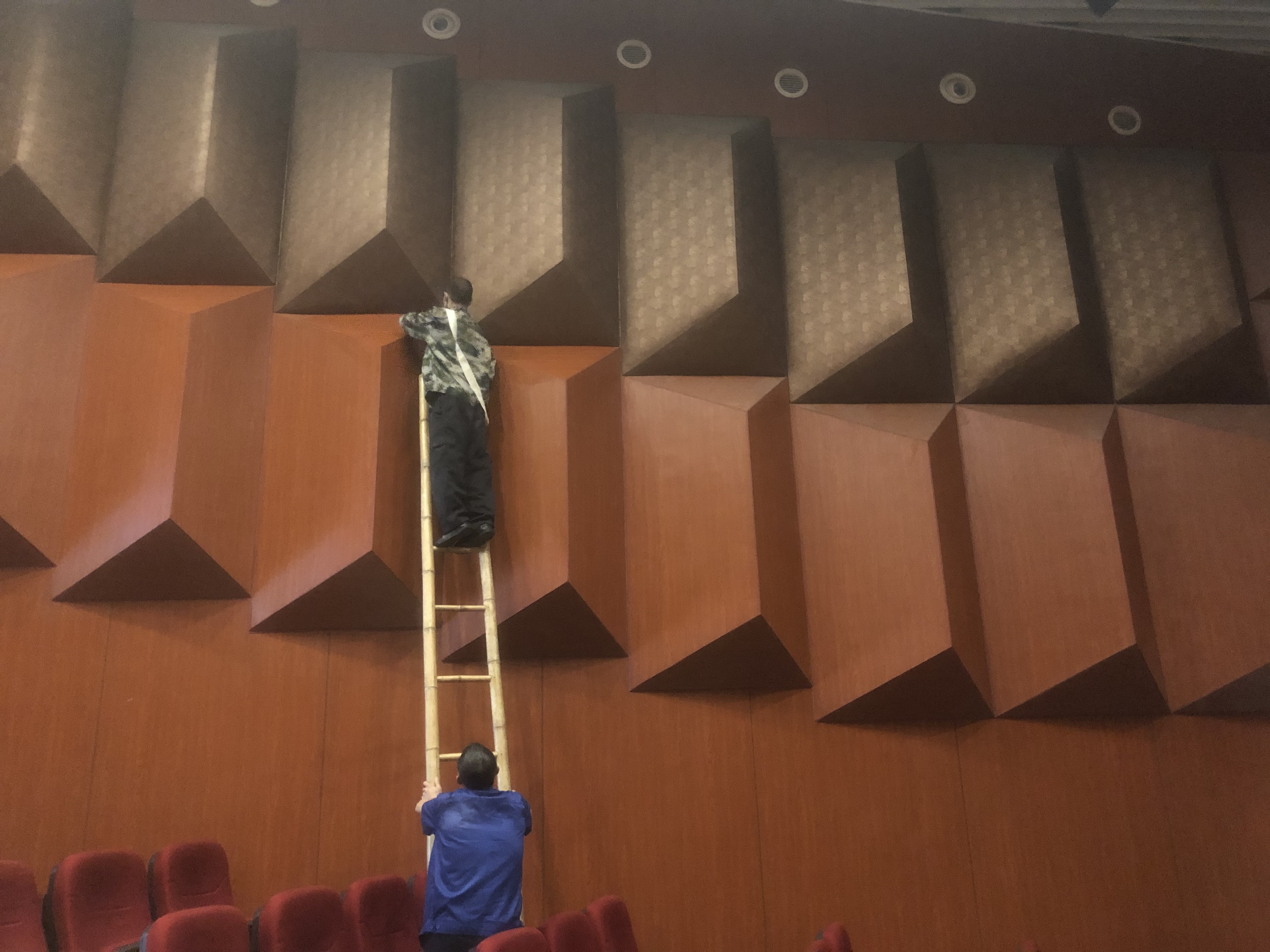 中心秩序维护队员高空作业清扫小音乐厅墙面卫生