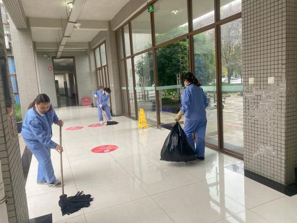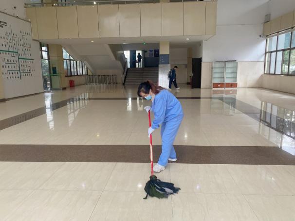 保洁正在对艺术大楼大厅、内庭进行实时卫生保洁