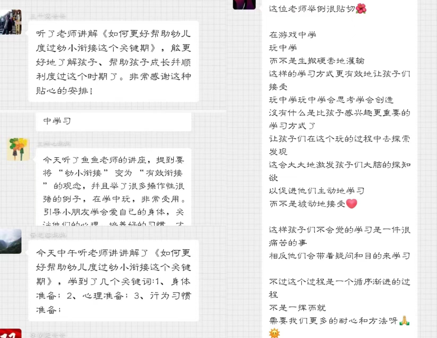 在讲座中,余老师分析了孩子在小升初过渡阶段出现的典型问题,并提出了有效的应对策略,得到了家长们的一致认同。家长们纷纷表示要“尊重孩子生命成长的发展规律,关注孩子的身心健康,学习与成长从改变自我开始,从孩子的内心出发,做好孩子学习成长路上的陪伴者。”此次公益讲座及时地为大班幼儿家长解疑答惑,必将有效地指导着他们陪伴孩子们顺利、愉快、健康地度过幼升小的这个关键期!(贺棋撰稿)
