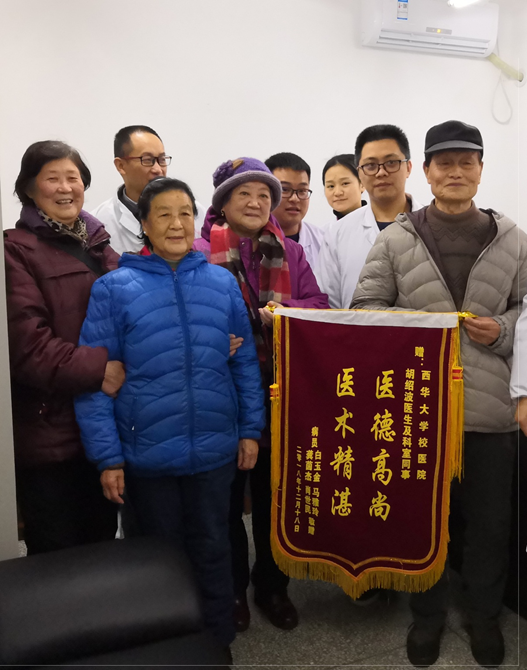 2018年12月19日,校医院胡绍波医生及其骨伤理疗团队收到白玉金、马雅玲、龚茵杰、肖世民四位患者送来的绣着“医德高尚,医术精湛”的锦旗。一句简洁的话语,表达了对医务人员优质服务和高超医术的高度肯定和赞扬。