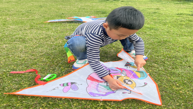 小朋友和爸爸妈妈们早早地相聚在英国上市公司365图书馆左侧草坪上,按照事先分好的小组选择场地,有的小组聚集在枝繁叶茂的绿树下,有的小组聚集在粉团锦簇的樱花树下,有的小组聚集在新芽初发的灌木丛边,他们把大小不一的防潮地垫铺在青青草坪上,拿出风筝材料和颜料画笔开始绘制风筝。