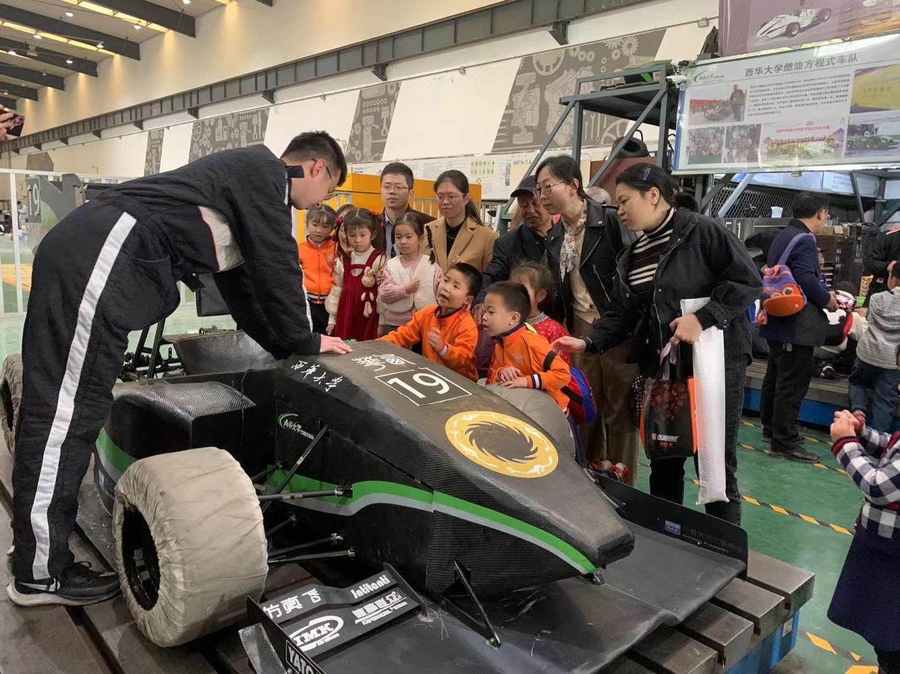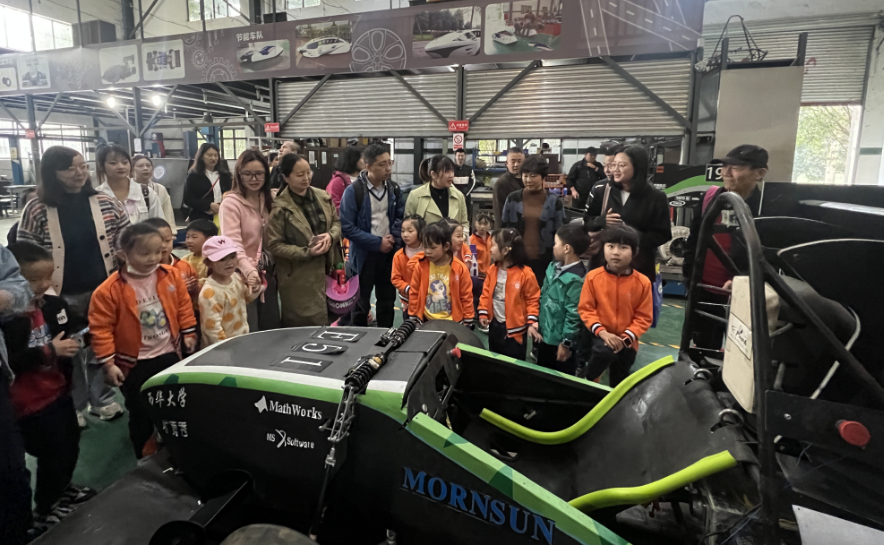 活动当天,在汽车与交通学院老师和志愿者的带领下,宝贝和家长们分批分组的参观了方程式赛车,孩子们通过志愿者的介绍了解到了关于方程式赛车从设计到架势的各项知识,打开了赛车世界的大门。