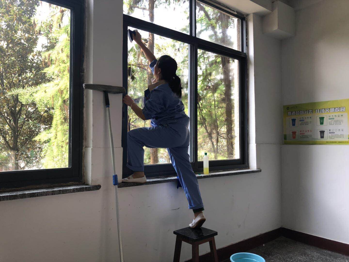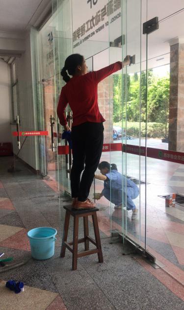 (保洁人员正在对玻璃门窗进行清洁工作)
