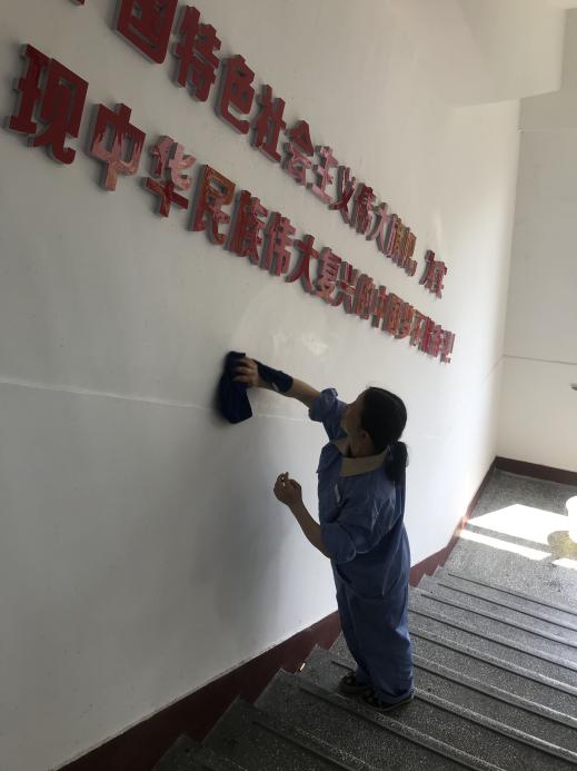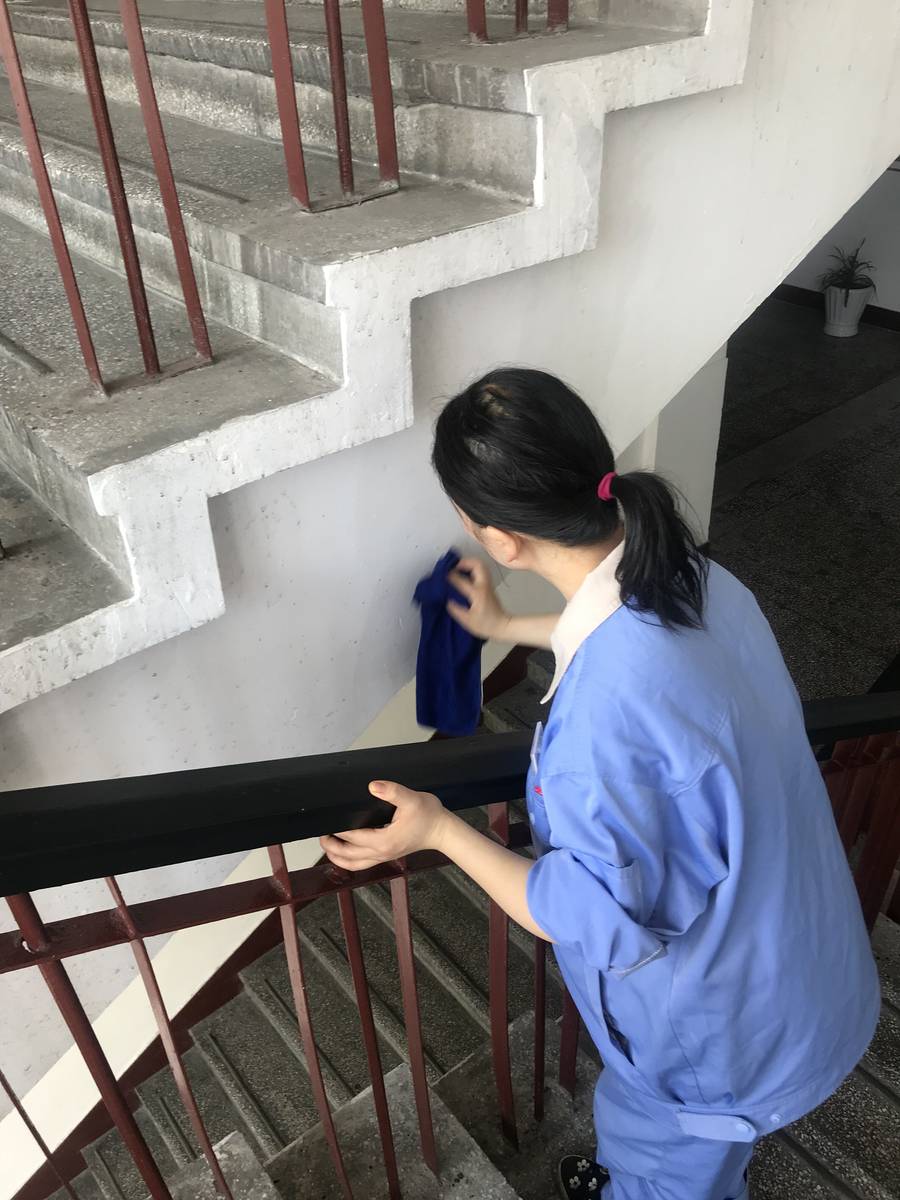 (保洁人员正在对楼梯墙面进行清洁工作)