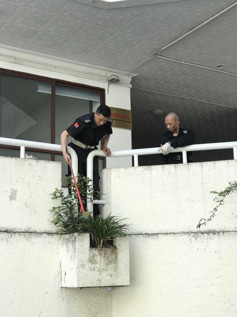 (队员正在对走道花台杂草进行清除工作)