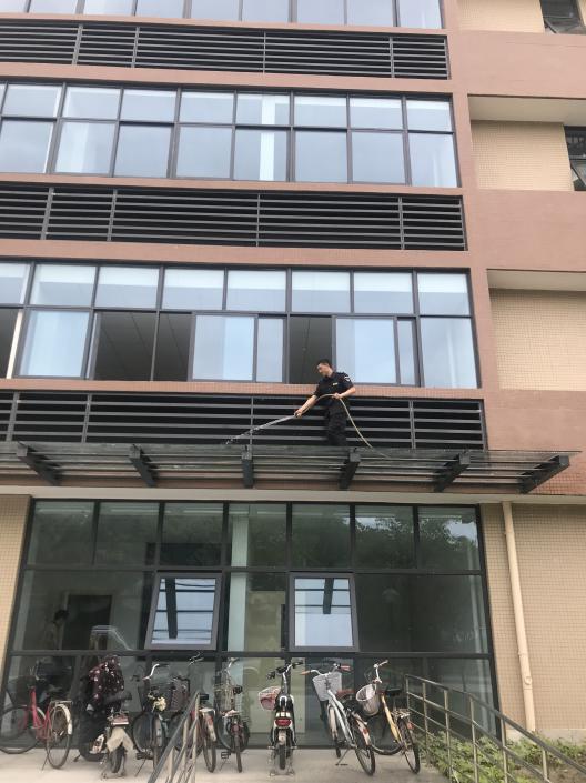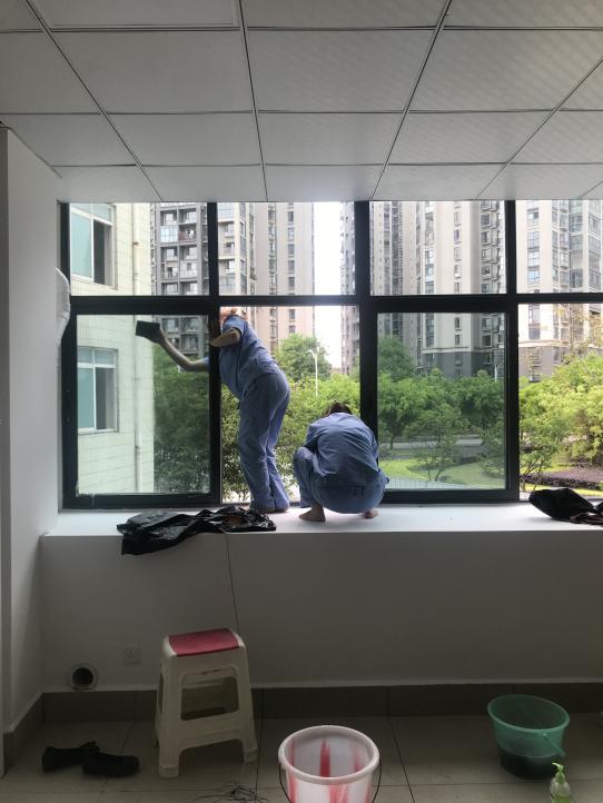 这次开荒保洁工作要求彻底将新装修的一楼、二楼区域进行卫生清洁工作,要求地面、墙面、屋顶都没有一丝污渍痕迹。本次参与开荒的保洁及秩序维护队员团结合作,不怕辛苦,认真完成开荒工作。保洁人员首先对区域内的过道地面进行拖扫。其次,针对新楼玻璃窗户多的情况,保洁人员两人一组使用专业的擦玻器进行擦拭清洁工作,最后,将区域内装修后遗留的建渣及涂料死角进行酸洗和消杀。秩序维护队员对区域外的屋面玻璃进行冲洗,在秩序维护队长黄明福的带领下,两名队员不间断的坚持工作。队长及队员们的鞋子全部打湿,依然穿着湿鞋子继续对大楼内的大量杂物进行了清理工作。